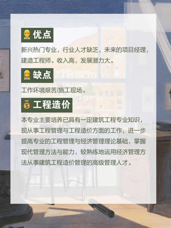 新兴热门专业,行业人才缺乏,未来的项目经理,建造工程师。收入高,发展潜力大。