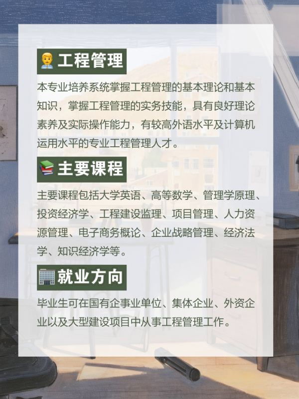 本专业培养系统掌握工程管理的基本理论和基本知识,掌握工程管理的实务技能,具有良好理论素养及实际操作能力,有较高外语水平及计算机运用水平的专业工程管理人才。