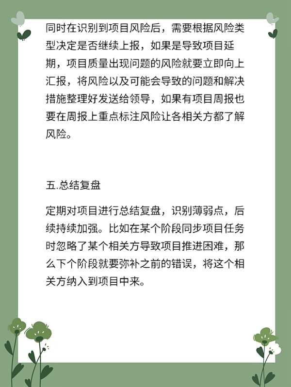 同时在识别到项目风险后,需要根据风险类型决定是否继续上报,如果是导致项目延期,项目质量出现问题的风险就要立即向上汇报,将风险以及可能会导致的问题和解决措施整理好发送给领导,如果有项目周报也要在周报上重点标注风险让各相关方都了解风险。