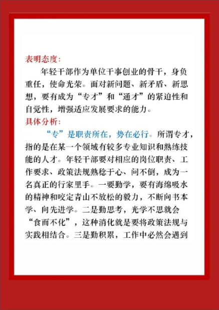 具体分析:“专”是职责所在,势在必行。所谓专才,指的是在某一个领域有较多专业知识和熟练技能的人才。年轻干部要对相应的岗位职责、工作要求、政策法规熟稔于心、问不倒,成为一名真正的行家里手。