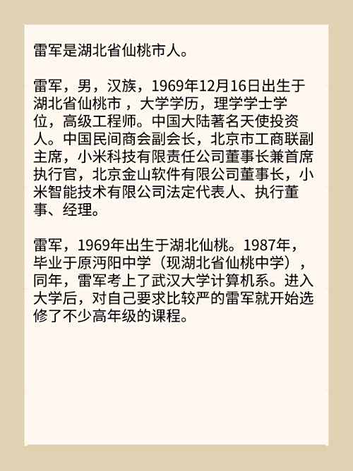 雷军,男,汉族,1969年12月16日出生于湖北省仙桃市 ,大学学历,理学学士学位,高级工程师。中国大陆著名天使投资人。中国民间商会副会长,北京市工商联副主席,小米科技有限责任公司董事长兼首席执行官,北京金山软件有限公司董事长,小米智能技术有限公司法定代表人、执行董事、经理。