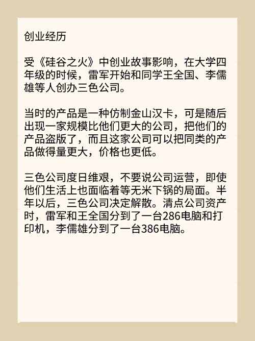 受《硅谷之火》中创业故事影响,在大学四年级的时候,雷军开始和同学王全国、李儒雄等人创办三色公司。