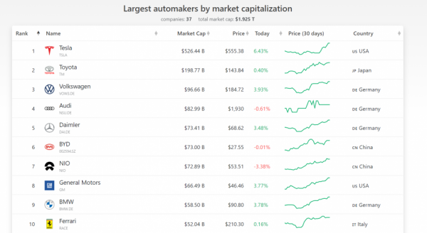 而特斯拉作为造车新势力的领头羊,更是“带领”一众新能源车企纷纷在市值上赶超传统车企。其中,国内造车新势力纷纷上榜全球车企市值20强,蔚来以728.9亿美元的市值获得第7的排名,将通用、宝马这些传统车企甩在身后,就连超跑品牌法拉利在市值上也跑不赢蔚来。