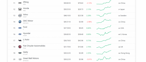小鹏汽车与理想汽车分别以508.3亿美元、367.6亿美元的市值占据全球第11和17名,与一众传统车企巨头平分秋色。
