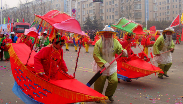 划旱船,传说是为了纪念大禹治水有功的。旱船不是真船,多用两片薄板,做成船形,再蒙上彩布,人在中间如同坐在船里一样,然后手拿桨,做划行样子,边歌边舞,另有一男子打扮成船客,以各种滑稽的动作来逗笑观众。这也是过年里很多地区都流行的活动。