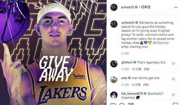 抽奖发起人:卡鲁索,作为湖人队的一名球员,他在个人Ins上发起了此次抽奖活动。