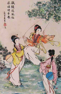 荡秋千。古时的秋千多用树桠枝为架,再栓上彩带做成,后来逐步发展为用两根绳索加上踏板的秋千,很受儿童们的喜爱。