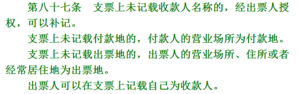 ②出票地(支票上未记载出票地的,则出票人的营业场所、住所、经常居住地为出票地)。是指票据法规定应当记载而没有记载,如未记载可以通过法律规定进行推定而不会导致票据无效。