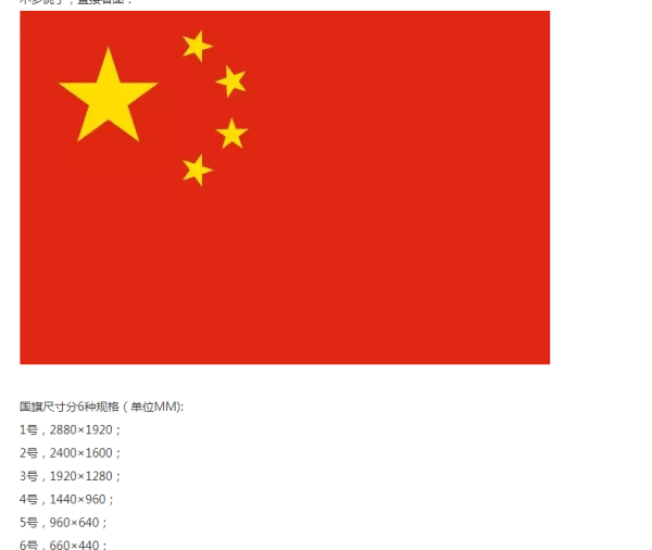 《国旗法》对国旗的制作有明确规范。国旗尺寸分6种规格(单位CM):