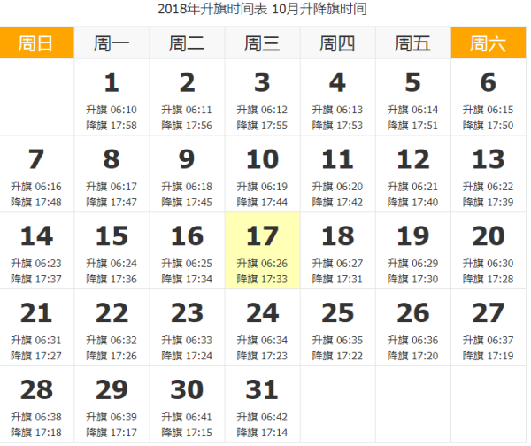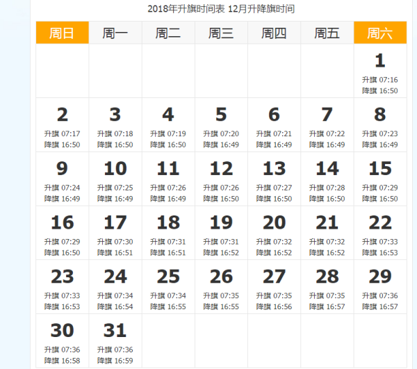国旗的降旗时间同样分为逐渐推迟和逐渐提前的两个时段。遇到阴天、雨天和雪天,升旗和降旗的时间与前一天相同。