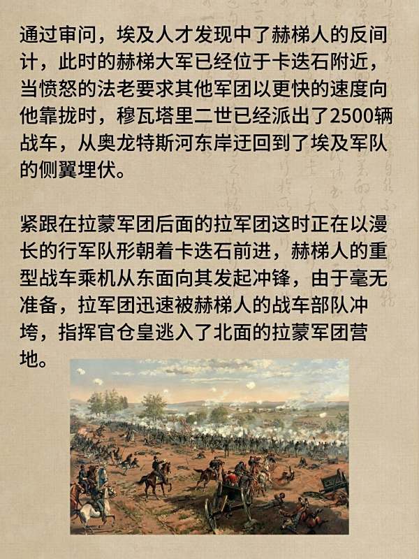但当法老本人的先头部队在卡迭石附近扎营后却又抓获了两名赫梯军队的探子。通过审问,埃及人才发现中了赫梯人的反间计,此时的赫梯大军已经位于卡迭石附近,当愤怒的法老要求其他军团以更快的速度向他靠拢时,穆瓦塔里二世已经派出了2500辆战车,从奥龙特斯河东岸迂回到了埃及军队的侧翼埋伏。