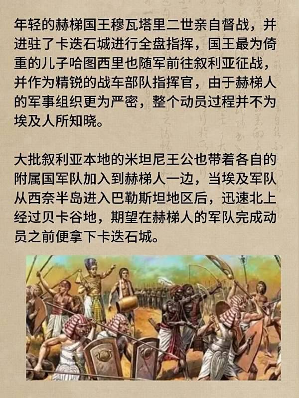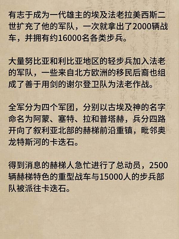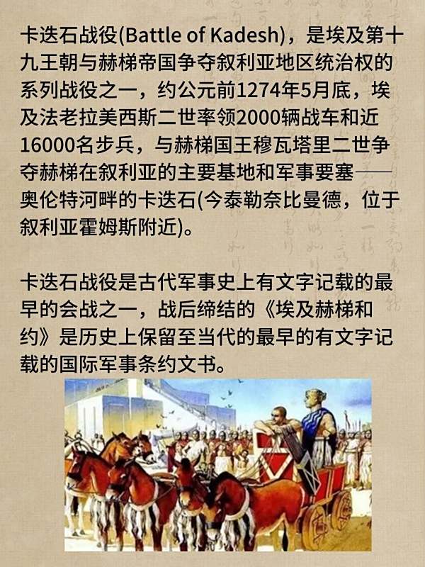 卡迭石战役是古代军事史上有文字记载的最早的会战之一,战后缔结的《埃及赫梯和约》是历史上保留至当代的最早的有文字记载的国际军事条约文书,有志于成为一代雄主的埃及法老拉美西斯二世扩充了他的军队,一次就拿出了2000辆战车,并拥有约16000名各类步兵。