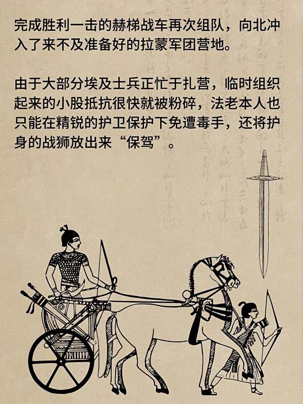 完成胜利一击的赫梯战车再次组队,向北冲入了来不及准备好的拉蒙军团营地,由于大部分埃及士兵正忙于扎营,临时组织起来的小股抵抗很快就被粉碎,法老本人也只能在精锐的护卫保护下免遭毒手,还将护身的战狮放出来“保驾”。