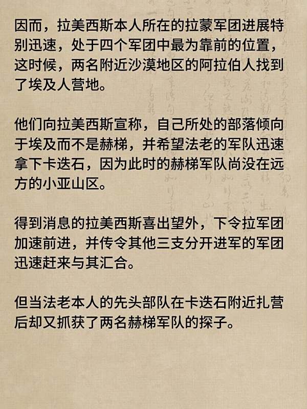 这时候,两名附近沙漠地区的阿拉伯人找到了埃及人营地,他们向拉美西斯宣称,自己所处的部落倾向于埃及而不是赫梯,并希望法老的军队迅速拿下卡迭石,因为此时的赫梯军队尚没在远方的小亚山区,得到消息的拉美西斯喜出望外,下令拉军团加速前进,并传令其他三支分开进军的军团迅速赶来与其汇合。