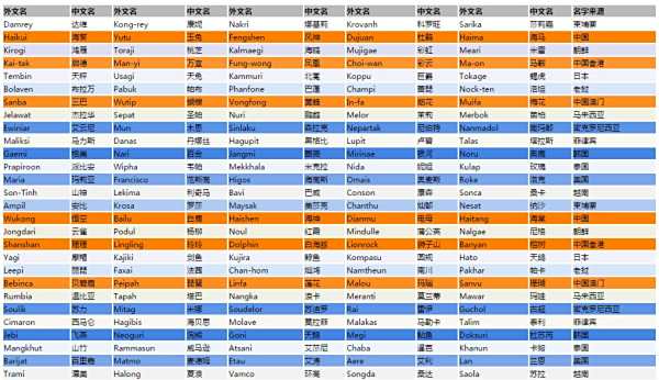 简单说,可能会受台风影响的14个国家和地区,每人提10个名字,共140个名字,大家排个表来轮流命名,循环使用。如果有台风出现比较有纪念意义(主要是造成重大灾害,也有2001年26号台风“画眉”是最靠近赤道的台风这种),那么这个台风的名字就被除名,然后另外提一个名字递补。