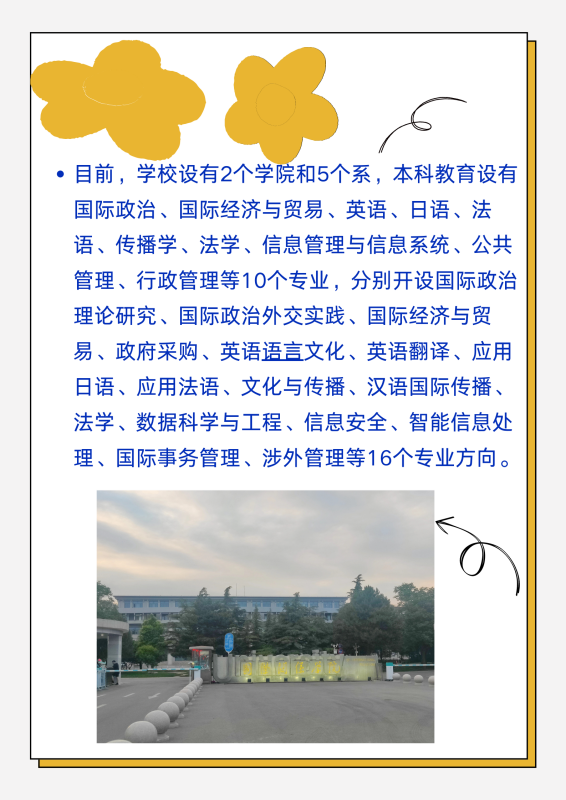 目前,学校设有2个学院和5个系,本科教育设有国际政治、国际经济与贸易、英语、日语、法语、传播学、法学、信息管理与信息系统、公共管理、行政管理等10个专业,分别开设国际政治理论研究、国际政治外交实践、国际经济与贸易、政府采购、英语语言文化、英语翻译、应用日语、应用法语、文化与传播、汉语国际传播、法学、数据科学与工程、信息安全、智能信息处理、国际事务管理、涉外管理等16个专业方向。