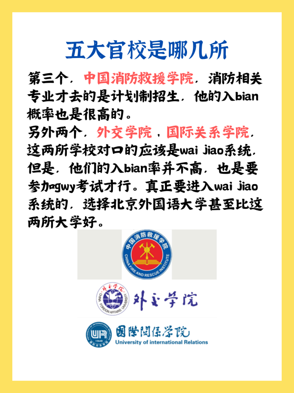 另外两个,外交学院、国际关系学院,这两所学校对口的应该是wai jiao系统,但是,他们的入bian率并不高,也是要参加gwy考试才行。真正要进入wai jiao系统的,选择北京外国语大学甚至比这两所大学好。