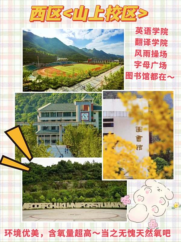 西区的风雨操场是研究生院、英语学院、新闻传播学院、翻译学院、东方语学院教育学院、马克思主义学院的报到地点,还有篮球场、网球场、字母广场、图书馆和茂密的歌乐森林。