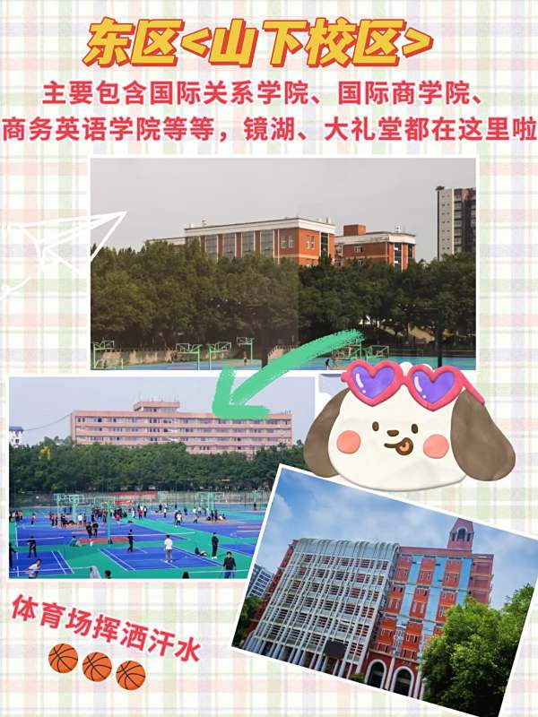 东区的太阳广场是国际关系学院、国际商学院、商务英语学院、社会系的报到地点,还有体育场、镜湖、大礼堂等。东区在山下,所以建筑都比较集中。宿舍有兰1、2、4、9,东区有快乐食间、东区食堂、紫薇堂、大西北美食、东苑餐厅这几个食堂。
