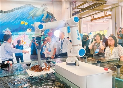 在电脑系统的控制下,协作型机械手臂轻巧地将培育珊瑚种苗的培养皿从1号水池垂直取出,稳稳地平移到旁边2号水池的上方,再精准地将培养皿浸入2号水池的特定位置。一连串流畅娴熟的动作,引来嘉宾的阵阵感叹和掌声。
