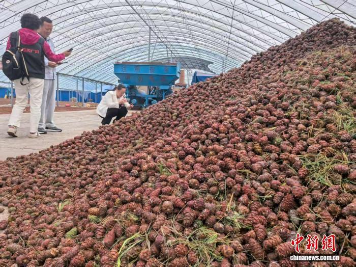 “这些都是刚脱粒的偃松子,需要晾晒烘干,然后破壳成偃松仁直接发往大连、青岛、梅河口等地。”位于大兴安岭新林区的大兴安岭印象北极食品有限公司院内,数十吨松子和松塔堆成小山占据了整个厂区。负责人老段一边指挥车辆运送松塔脱粒,一边蹲下来查看地上晾晒的偃松子的干燥程度。