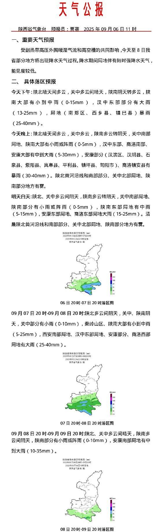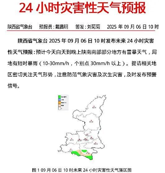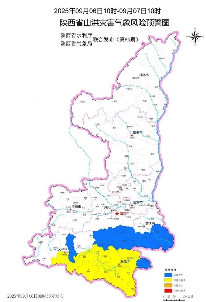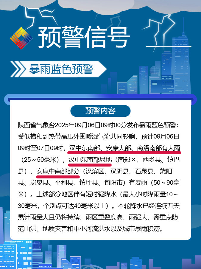 预计2025年09月06日10时至2025年09月07日10时,汉中市南郑区、西乡县、镇巴县,安康市汉滨区、汉阴县、石泉县、紫阳县、岚皋县、平利县、镇坪县、旬阳市等县(市、区)发生山洪灾害可能性较大(黄色预警),汉中市城固县,安康市宁陕县、白河县,商洛市丹凤县、商南县、山阳县、镇安县、柞水县等县有可能发生山洪灾害(蓝色预警)。请各地各部门落实防御责任,紧盯危险区与强降雨重叠区,加强实地监测与预警叫应,提前做好转移避险防范。