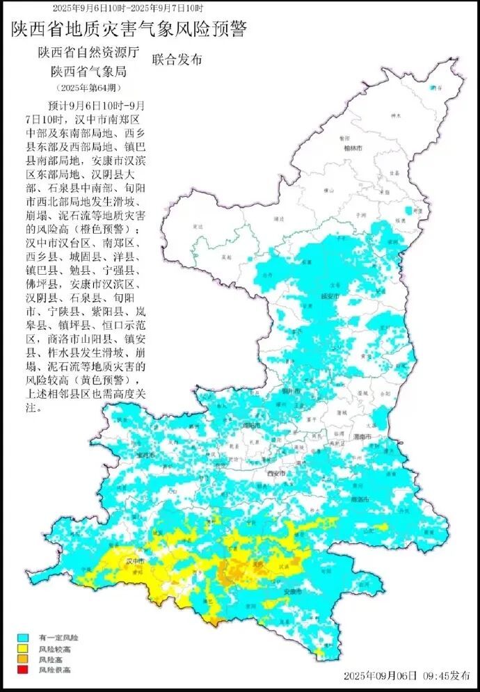 预计9月6日10时-9月7日10时,汉中市南郑区中部及东南部局地、西乡县东部及西部局地、镇巴县南部局地,安康市汉滨区东部局地、汉阴县大部、石泉县中南部、旬阳市西北部局地发生滑坡、崩塌、泥石流等地质灾害的风险高(橙色预警);汉中市汉台区、南郑区、西乡县、城固县、洋县、镇巴县、勉县、宁强县、佛坪县,安康市汉滨区、汉阴县、石泉县、旬阳市、宁陕县、紫阳县、岚皋县、镇坪县、恒口示范区,商洛市山阳县、镇安县、柞水县发生滑坡、崩塌、泥石流等地质灾害的风险较高(黄色预警),各地及有关部门单位要加强巡查排查,落实一线叫应机制,全力做好人员安全转移避险,上述相邻县区也需高度关注。