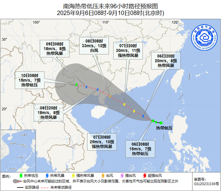 海南省气象台预计,该热带低压将以10-15公里的速度向西偏北方向移动,强度逐渐增强,将于6日加强为今年第16号台风,之后趋向广东中西部沿海,并将于7日夜间到8日上午在上述沿海登陆(强热带风暴级或台风级,28-33米/秒,10-12级),登陆后强度逐渐减弱。