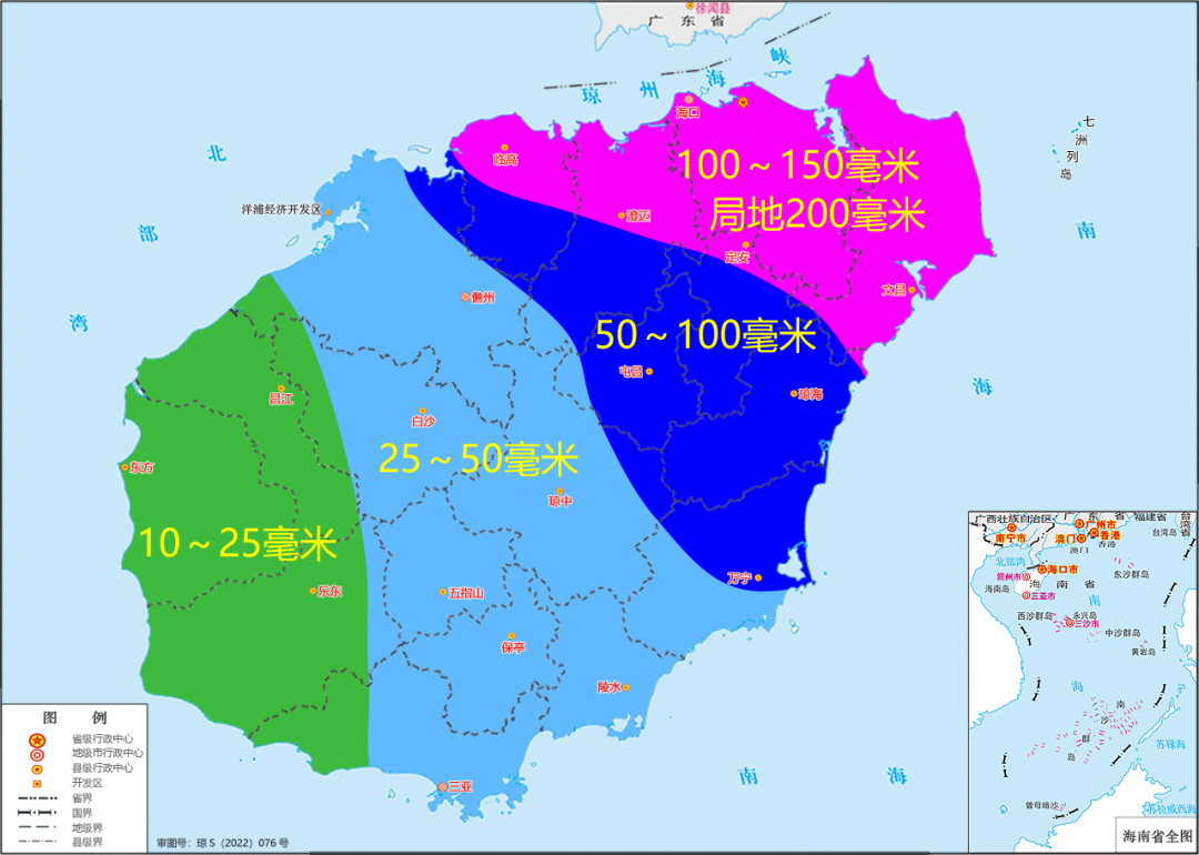 预计,7日08时~9日08时各地累积雨量:海口、文昌、定安、澄迈和临高等市县100~150毫米、局地200毫米;琼海、屯昌和万宁等市县50~100毫米,其余市县10~50毫米。
