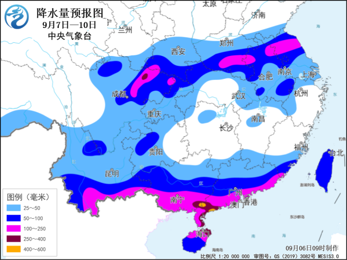 6日,中央气象台发布降雨预报,预计7日至10日,华南中南部、云南大部、贵州自东向西先后有大到暴雨,其中广东南部、海南岛北部、广西南部、云南南部等部分地区有大暴雨,广东西南部、广西东南部局地有特大暴雨;上述部分地区累计降雨量有80~180毫米,局地可达250~400毫米;部分地区并有短时强降雨(最大小时雨量30~50毫米,局地90~110毫米)、雷暴大风等强对流天气。