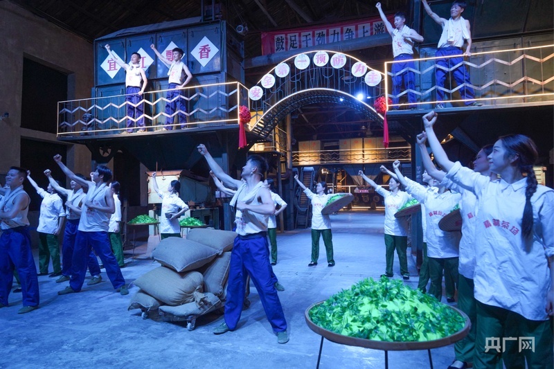 宜红茶工业遗产展示馆内,沉浸式大秀《一叶芳华》正在上演:身着上世纪七八十年代工装的“茶工”们端着“迎宾茶”穿梭在百年车间,游客不自觉加入舞动人群,仿佛穿越回“宜红茶出口创汇”的繁盛年代。