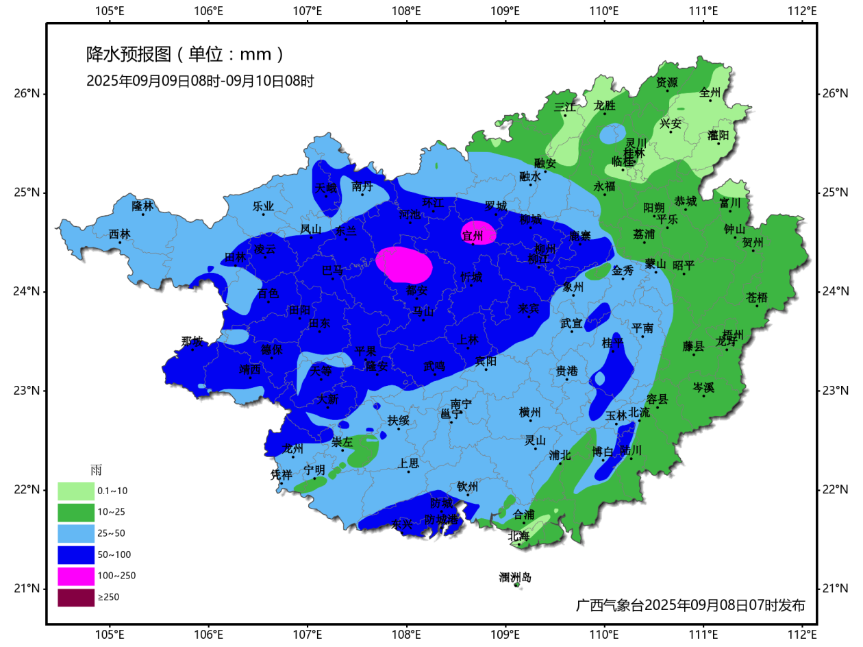 9日,桂西、桂北有大雨到暴雨、局地大暴雨或特大暴雨,其他地区有小到中雨、局地大雨或暴雨。桂北部分地区有5~6级、阵风7~8级大风。