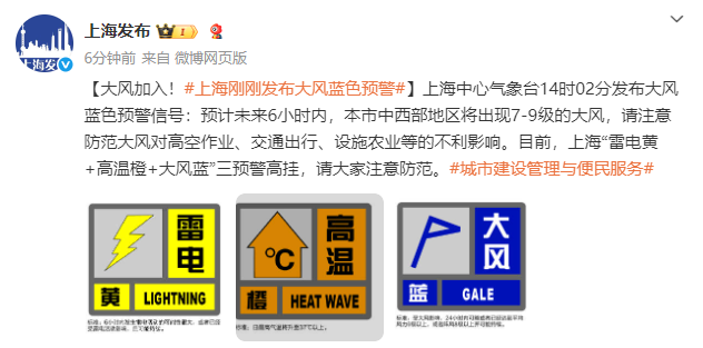 上海中心气象台14时02分发布大风蓝色预警信号:预计未来6小时内,本市中西部地区将出现7-9级的大风,请注意防范大风对高空作业、交通出行、设施农业等的不利影响。目前,上海“雷电黄+高温橙+大风蓝”三预警高挂,请大家注意防范。