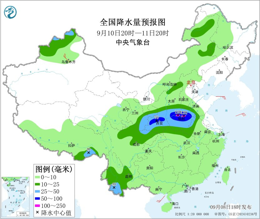 在9月10日20时至11日20时的预报图上,河南中北部呈现出代表高雨量的刺眼红紫色。数据显示,河南中北部等地的部分地区过程降雨量可达100至120毫米,已达到大暴雨量级。