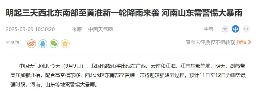 据河南省气象台消息,9月10日夜里至11日我省有一次大范围强降水过程,主要强降水时段在11日。