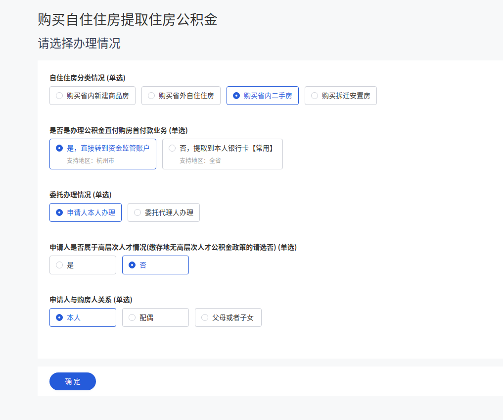 账号登录后,选择“杭州市”—“部门服务”—“市公积金中心”—“购买自住住房提取住房公积金”事项办理,限杭州市二手房购房人本人办理。