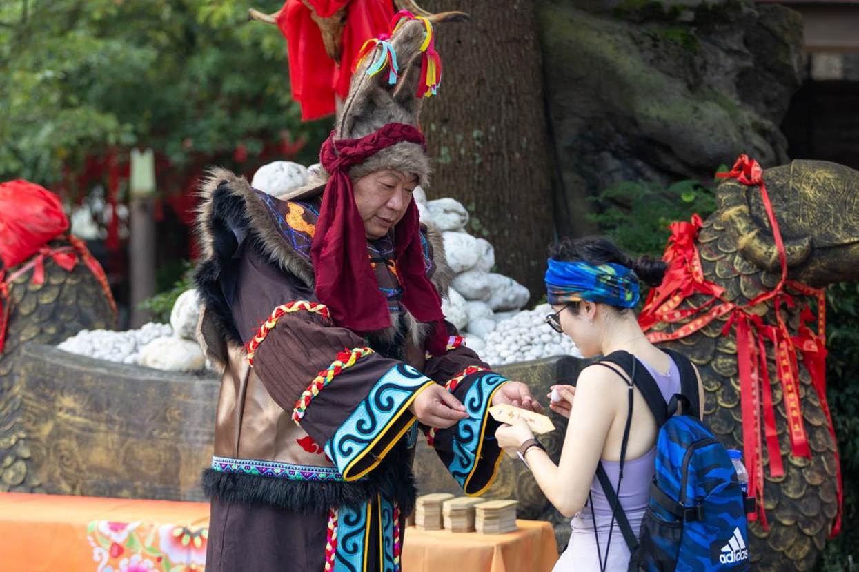 9月13日当天,狂欢节白天活动亮点密集。尔玛古道定时上演的“羌族民俗快闪”成为一道亮丽风景线,羌舞轻盈灵动、羌歌悠扬婉转,传递着非遗文化的蓬勃活力;羌情园11:30开启的“羌族婚礼展演”,完整还原传统羌家婚礼流程,生动展现羌族婚俗文化的独特韵味;云中农场西羌神韵的“羌王判案情景剧”欢乐开演,演员身着传统服饰倾情演绎,还热情邀请游客上台扮演羌王参与探案,诙谐有趣的情节与沉浸式体验让现场笑声、掌声此起彼伏。此外,云中农场的“羌族神话NPC巡游互动”“羌舞快闪”活动持续进行,羌王阿巴白构、九皇子尔国基等角色和羌家儿女穿梭于人群,与游客亲密拍照互动,现场热闹非凡。