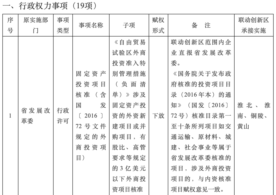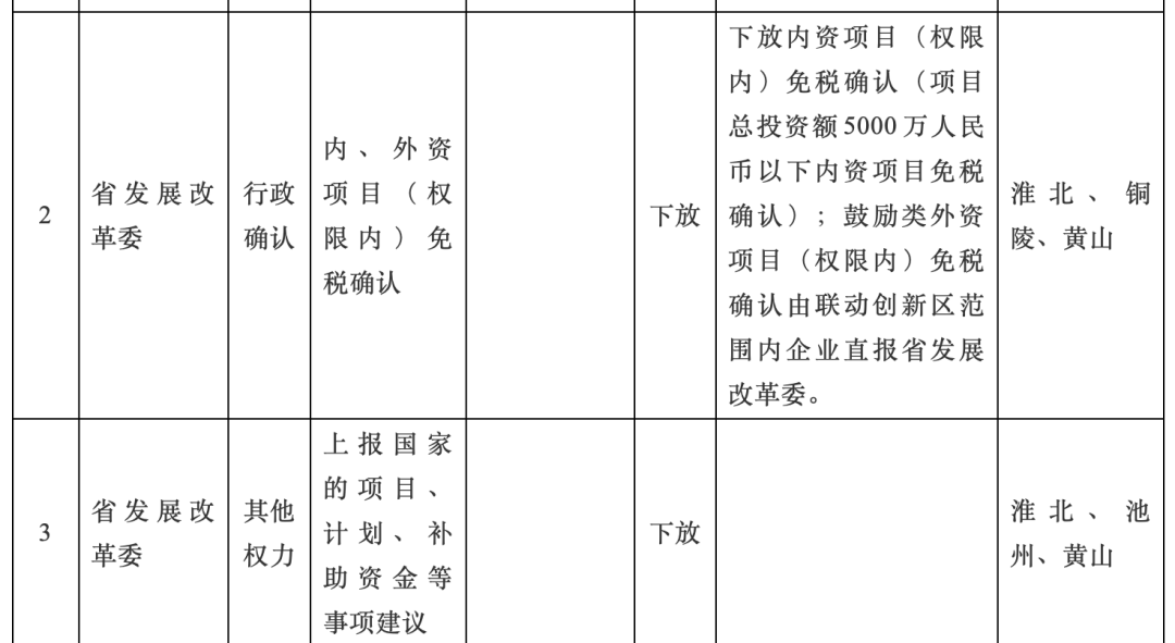 为贯彻落实省委、省政府关于中国(安徽)自由贸易试验区联动创新区建设有关要求,省政府决定赋予淮北、宿州、淮南、六安、铜陵、池州、黄山7个联动创新区34项省级经济社会管理事项,其中,行政权力事项19项、公共服务事项11项、行政权力中介服务便利化改革事项2项、内部审批事项2项。实施区域按照核定的范围执行。