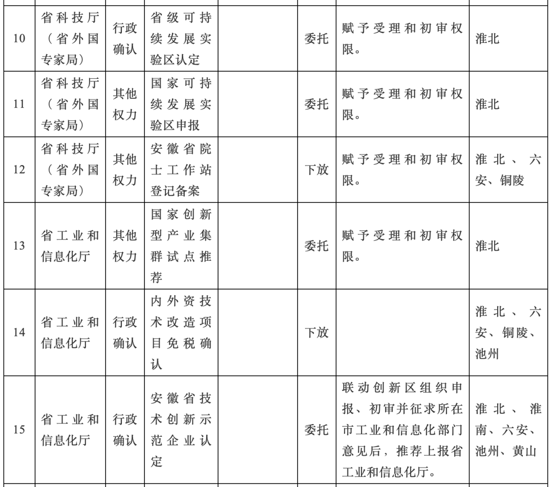 近日,安徽省政府决定赋予淮北、宿州、淮南、六安、铜陵、池州、黄山7个联动创新区34项省级经济社会管理事项,其中,行政权力事项19项、公共服务事项11项、行政权力中介服务便利化改革事项2项、内部审批事项2项。