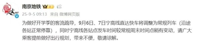 据@南京地铁:为做好开学季的客流疏导,9月6日、7日宁高线直达快车将调整为常规列车(沿途各站正常停靠),同时宁高线各站点发车时间较常规周末时间点稍有变动,请广大乘客提前做好出行规划,带来不便,敬请谅解。