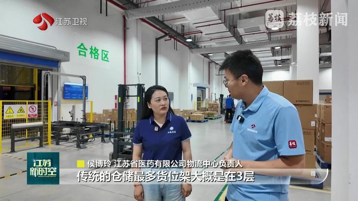 荔枝新闻中心记者郝朦说:“仓储物流降本增效一般就是让仓库存得更多,同时调度出入货效率更高。在江苏省医药有限公司物流中心,企业全新投用了立体库四向车系统、垂直提升机等一批自动化、智能化装备。这样一来,现代物流在有限空间内容量更大,周转更快,成本更低。”