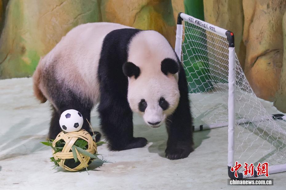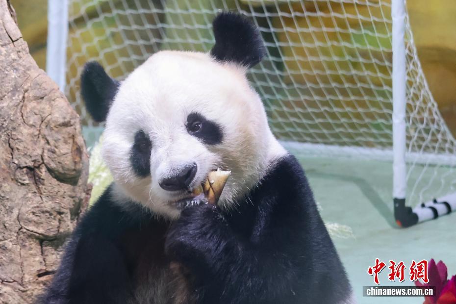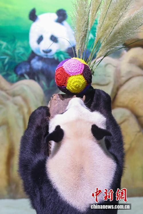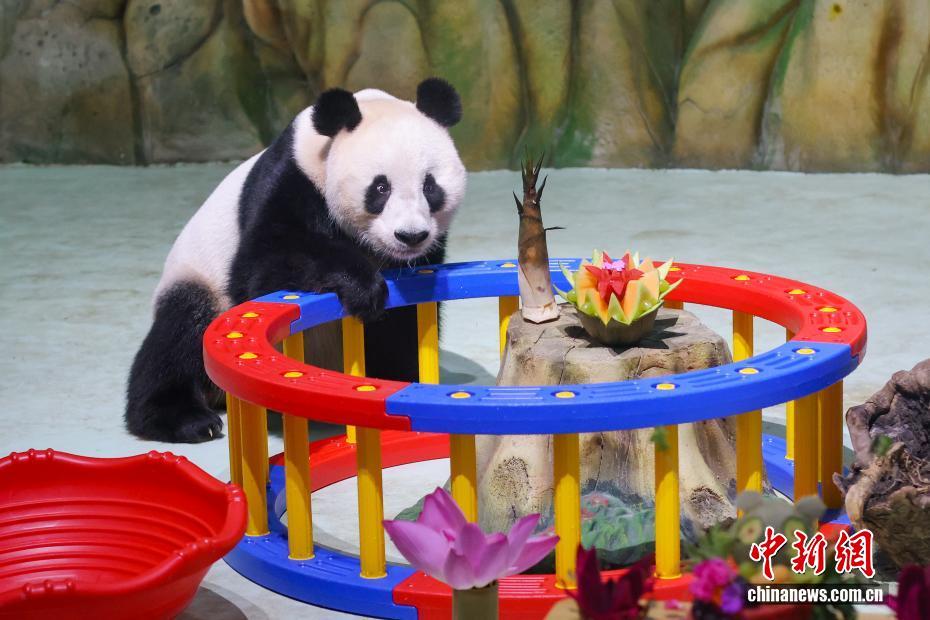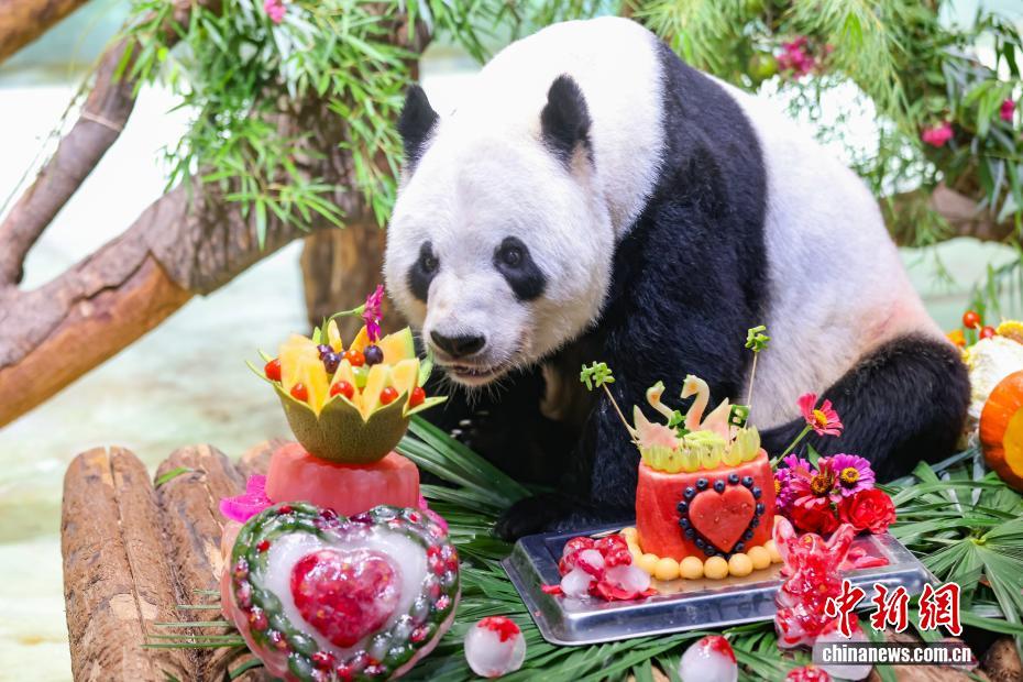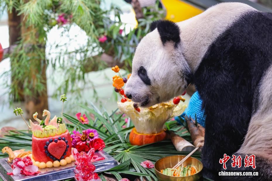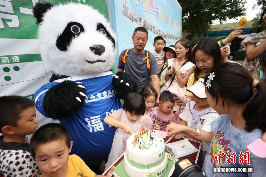 8月9日,江苏南京,生活在紫清湖野生动物世界的大熊猫绅威准备品尝为它精心准备的生日“蛋糕”和美食。该野生动物世界生活着六只大熊猫,园方为它们轮流举办生日见面会,精心布置的馆舍、丰盛的生日“礼物”、独特的庆生仪式,吸引了众多家长带着孩子前来,为大熊猫送祝福。