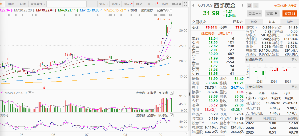 受国际金价上行拉动,西部黄金股价9月以来大幅上涨,9月10日盘中触及33.66元/股的历史新高,自8月29日至9月11日,10个交易日涨幅达到67.75%。9月11日股价小幅回落,收盘报31.99元/股。