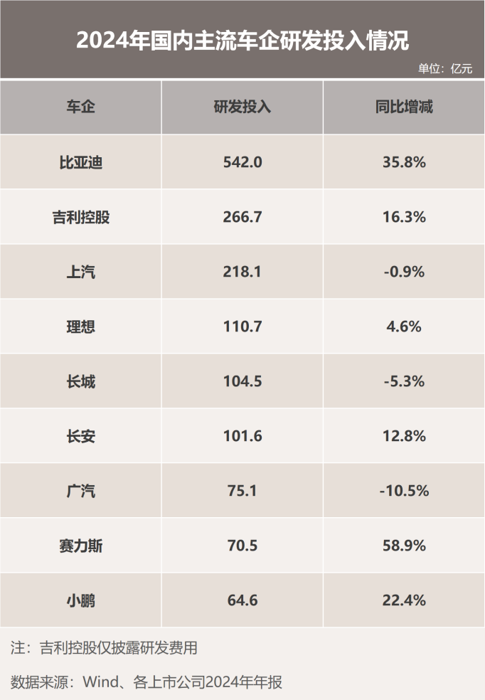 再对比同行,从已经公布2025半年报的国内主流车企来看,吉利控股上半年研发费用147亿元,长城汽车研发投入为60亿元、理想为53亿元、小鹏为42亿元,比亚迪一家的研发投入几乎等于四家车企之和。