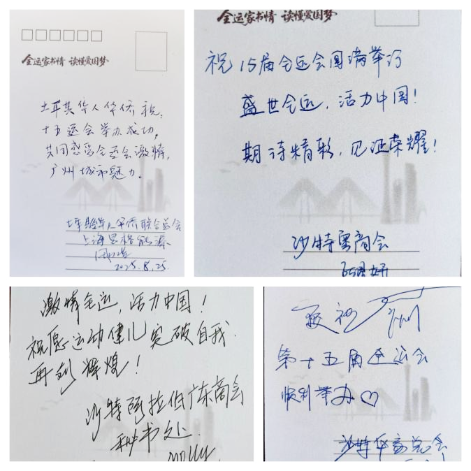 借此次访问交流契机,多位土耳其和沙特侨胞亲手书写了“全运家书”。“祝十五运会圆满成功!”“怀赤子南国心,期盼中华健儿再创辉煌。”……这些家书字句朴实、情感真挚,承载着对祖国和家乡的思念,对十五运会举办的美好祝愿。
