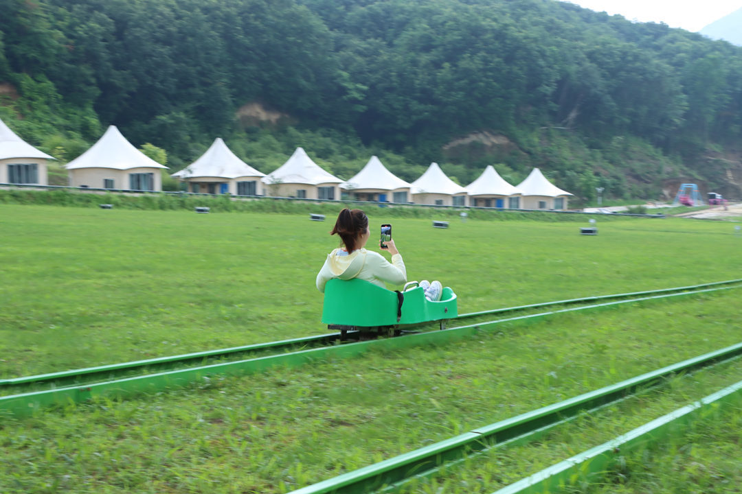 距离老界岭约20公里,老界岭滑雪场正上演“变形记”,10万平方米的山地草甸热闹非凡,滑草车疾速俯冲,草地越野车呼啸驰骋,动感项目引发游客阵阵尖叫。