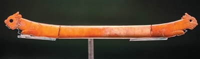 独立展柜里陈列着一件双虎首玉璜,器身有着明显的拼接痕迹。吴卫红介绍,右侧虎首为20世纪80年代征集所得,左侧残件则于2016年出土,时隔30余年重聚一体。透过玉璜表面的“时光裂痕”,观众可以感受到考古工作的艰辛与厚重。