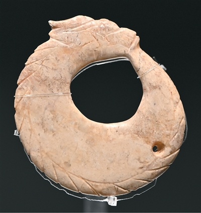 玉龙为灰白色,器身扁平,首尾相衔呈环状,龙首吻部凸出,头顶伸出两角,耳、嘴、鼻、眼以阴线刻出。龙身外缘阴刻一周17条斜线,象征龙鳞,是迄今所见年代最早的有角有鳞的玉龙。仔细观察,龙身近尾部有一钻孔,可以系挂或连缀。