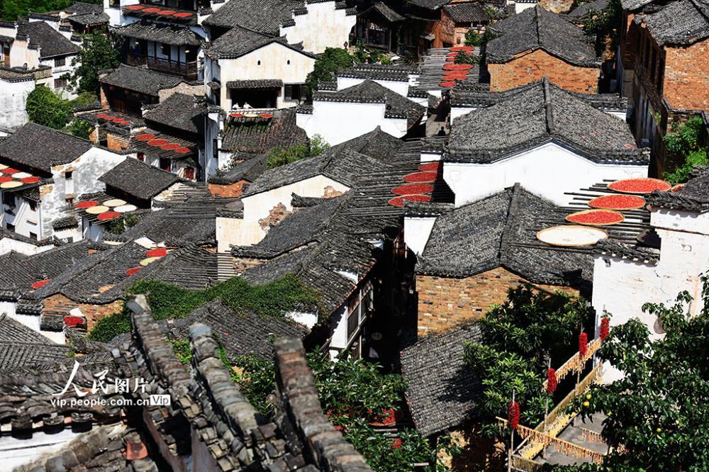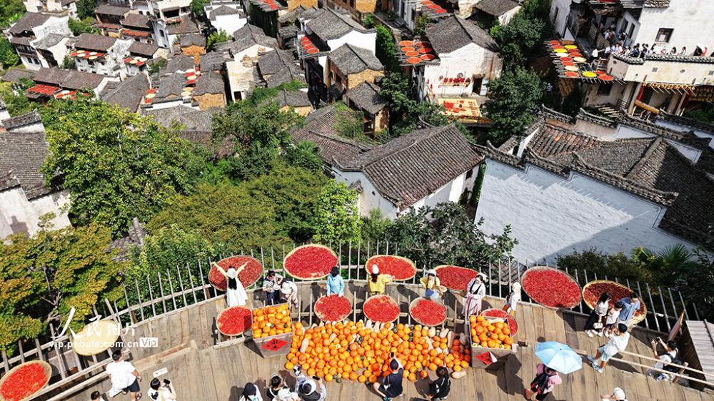 2025年8月9日,江西省上饒市婺源縣篁嶺村,當地村民趁着晴好天氣晾曬紅辣椒、玉米、南瓜等農作物。獨特的“曬秋”場景吸引了游客前來打卡拍照。汪建林攝(人民圖片網)