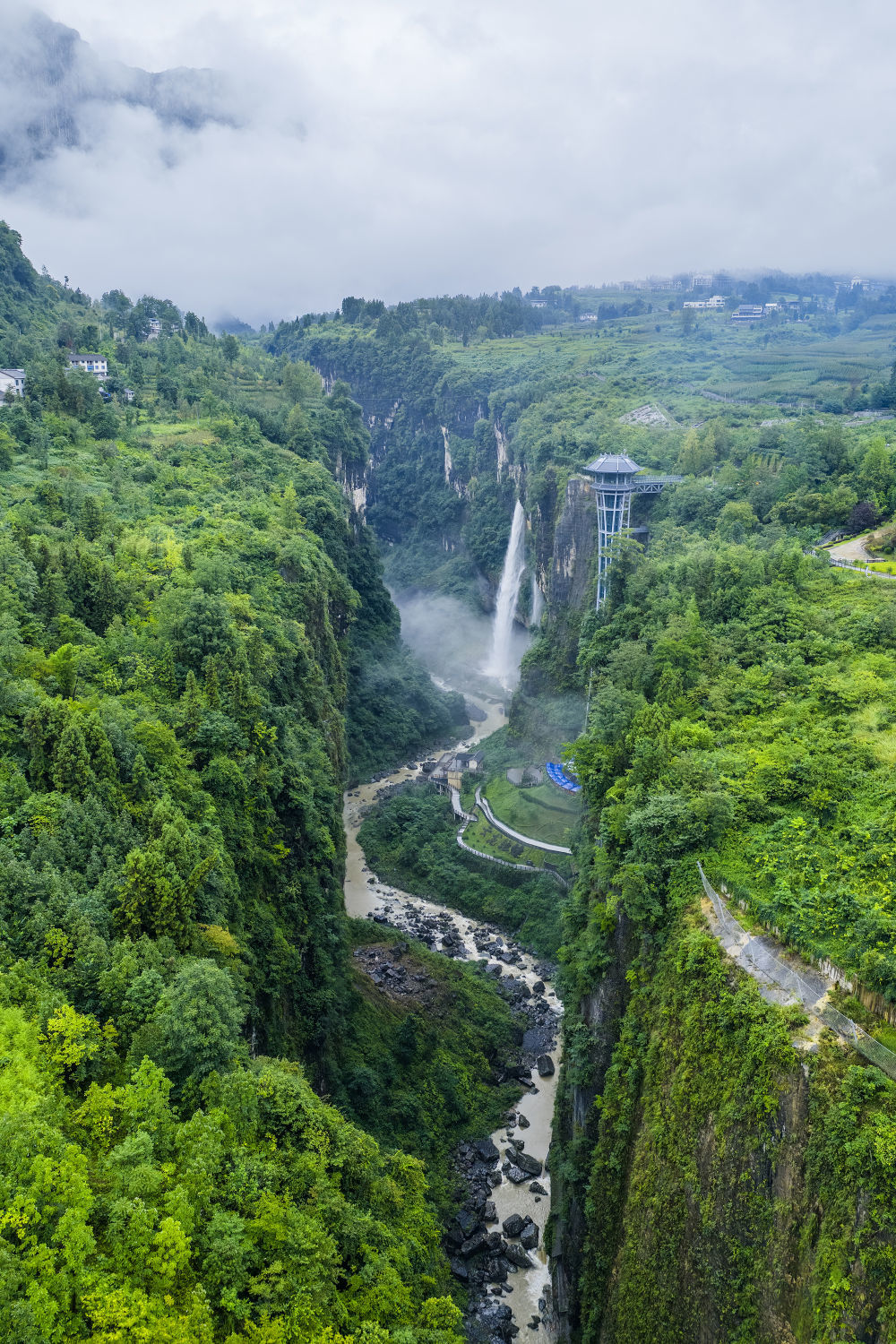 ↑2025年8月11日拍摄的恩施大峡谷雨后景观,云龙地缝幽深壮阔,周边民居错落有致。(无人机照片)CICPHOTO/杜维 摄